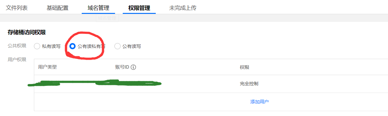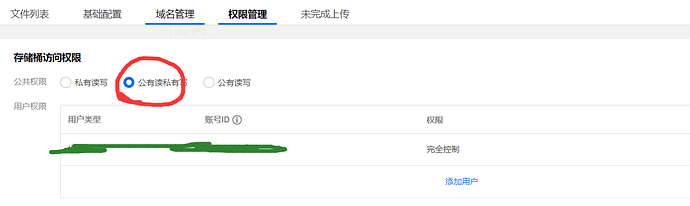 3、将权限管理中的存储桶访问权限设置为公有读私有写