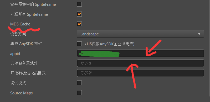 5、在cocosCreator中构建发布,MD5Cache需要勾选,写上你的appid,把刚才复制的域名复制到远程服务器地址上面即可