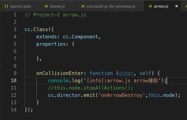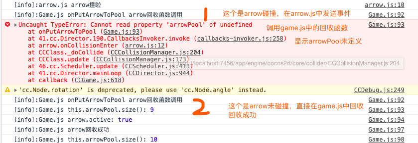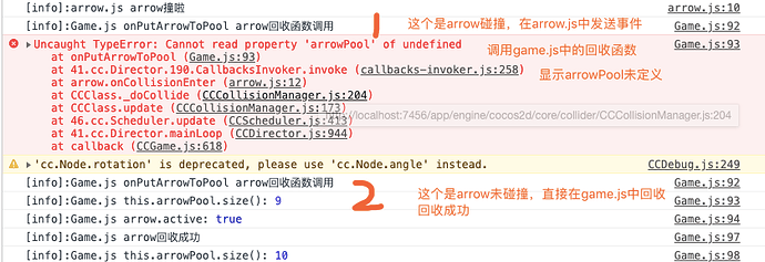 问题是这样的,游戏中会在Game.js中初始化arrow对象,arrow节点挂载了碰撞组件和arrow.js脚本组件,当arrow检测到碰撞时,在arrow.js中销毁。