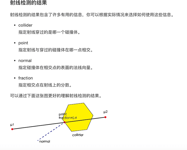 是在var results = cc.director.getPhysicsManager().rayCast(p1, p2, type); results里面,一个点对应一个results;还是说一个result对应一个类型的碰撞体,然后此碰撞体下有多个相交点,点的信息在point里面? 那这个point到底是单个的点,还是数组,相对应的,如果是数组的话,normal/fraction不应该也是数组吗。