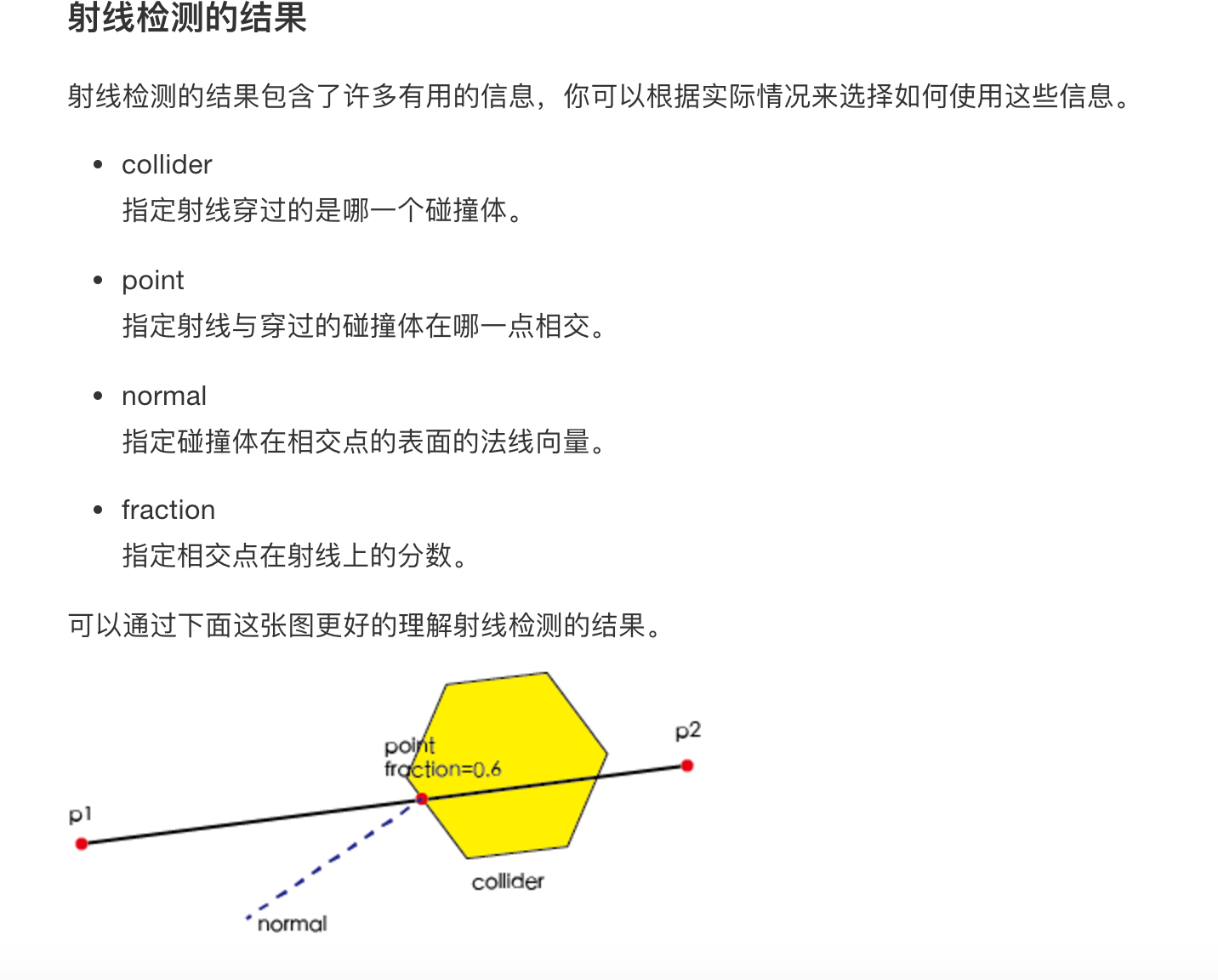 如图,官方文档,举例射线检测,不太明白一个线段如果和碰撞体有多个相交点,这些点的信息怎么取