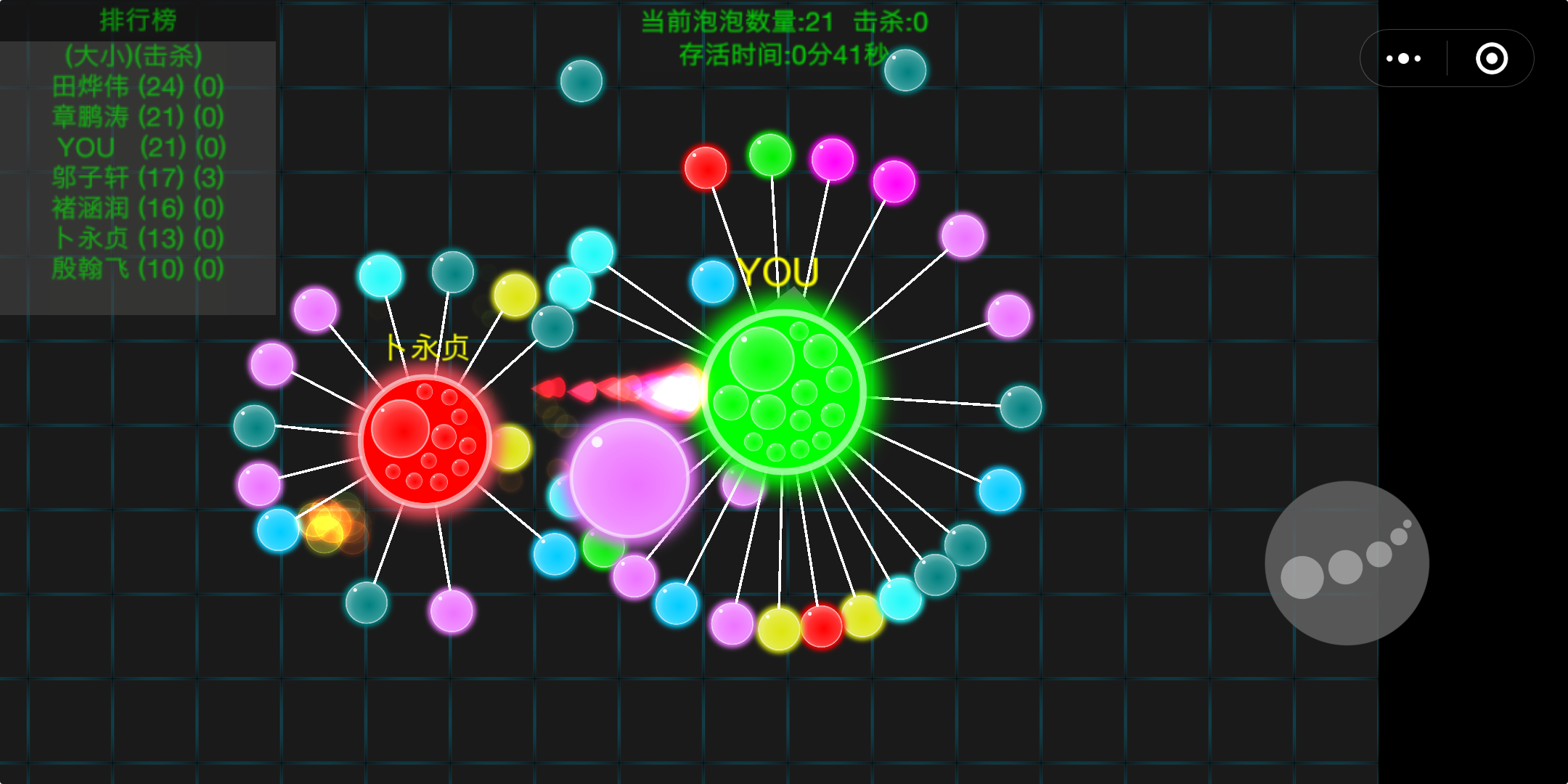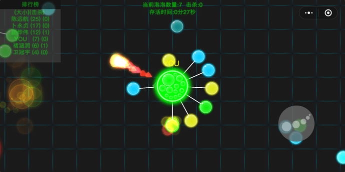 4:可以发射子弹,子弹碰到其他玩家的中心球,则其他玩家被击败,碰到其他玩家周围的小球,则被防护了。 发射子弹会减少一个小球。