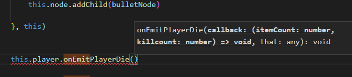关于emit事件: 玩家死亡,发射子弹等可以通过emit进行事件发射,在gamemanager类中,可以对相关的事件进行响应,但是emit 的参数不能自动提示,可以通过在player中编写一个 函数,定义callback的参数,这样,当在其他类中再去响应 die 事件的时候,就有代码提示了: