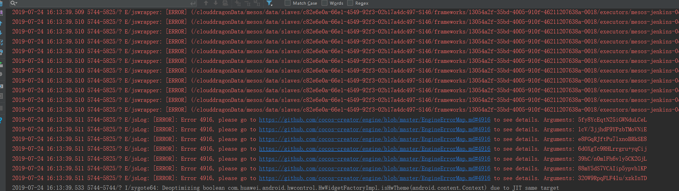 2019-07-24 17:40:31.239 17637-17709/? E/jswrapper: [ERROR] Failed to invoke FileSystemManager_readFileSync, location: /clouddragonData/mesos/data/slaves/c82e6e0a-66e1-4549-92f3-02b17a4dc497-S146/frameworks/13054a2f-35bd-4005-910f-46211207638a-0018/executors/mesos-jenkins-0dbfa48484ad428f82cc27842f9df5d2-consumer_dev/runs/f6e9c1e7-992d-4442-a142-55cc0c5bdfe0/jenkins/workspace/pec393c25c4af4bdfaed85c501b42e215/FastAppEngine_compile/FastAppEngine/android/game/core/src/main/jni/…/…/…/…/js-bindings/jsb_rt_file_system_manager.cpp:1077