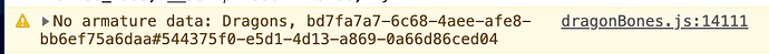 但是……如果保存动画时改了这个字段或者干脆删空,那么你读取时如果name不一样,就会报这个错,然后看不到动画。检查你 this.dragonBone.armatureName = ‘Dragons’;这一句,打开你的龙骨动画资源查看到底有没有 Dragons 这个 name。
