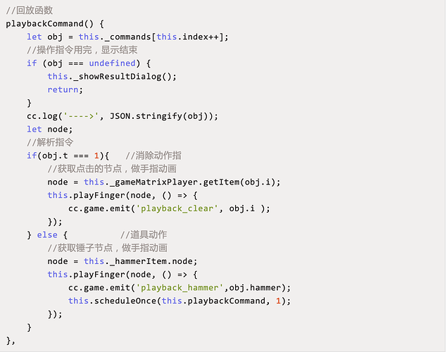 指令解析完成后,通过事件广播让具体的游戏模块去完成任务,还需要注意的是游戏中的异步动画,playbackCommand命令是在接收到消除动画完毕后才能执行下一条指令的解析。