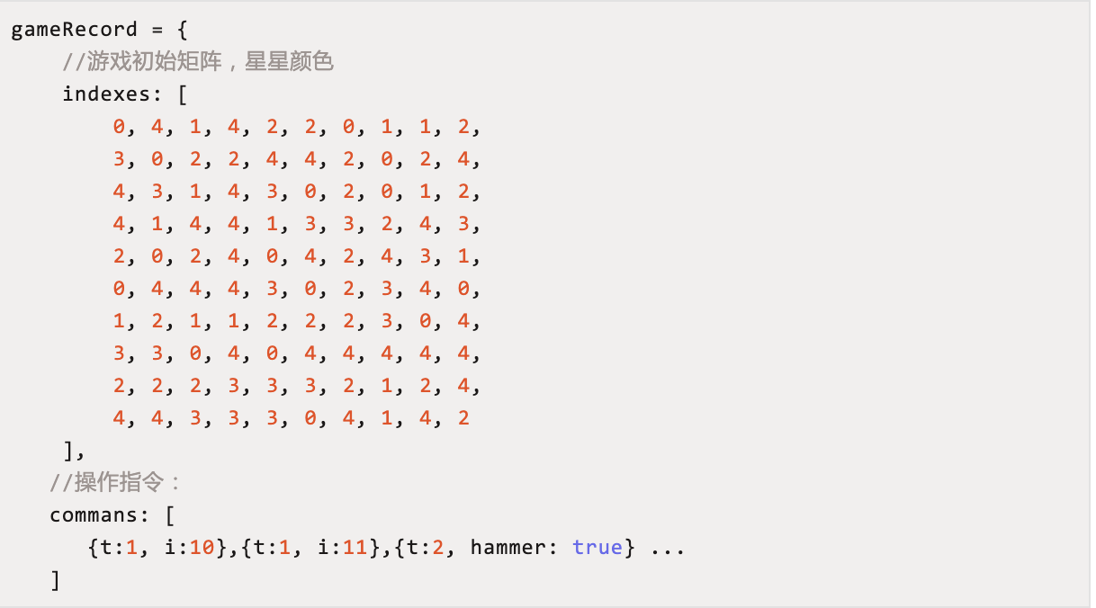 上面commans中t为操作类型,t=1为消除操作,i是上面indexes数组的下标索引。除了要记录消除操作外还要记录道具的使用t=2是道具的使用,hammer:true表示选中锤子道具。