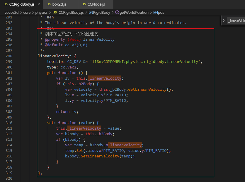 刚体只有这个:RigidBody.getLinearVelocityFromWorldPoint 还有个是cc.RigidBody.linearVelocity 哪个可以获取到呢? 我用的是TS写的