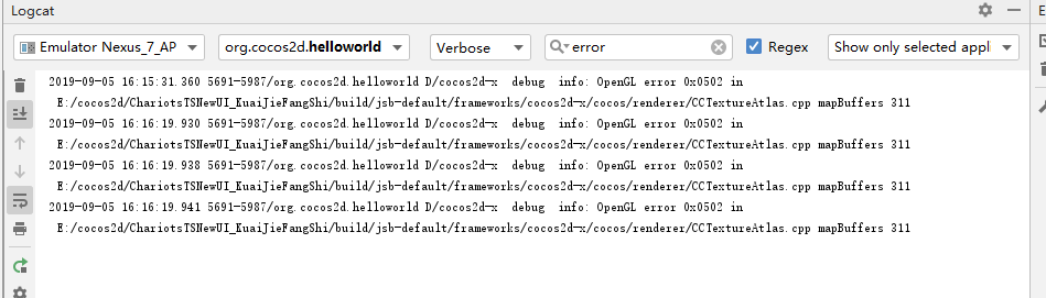 2019-09-05 16:16:19.941 5691-5987/org.cocos2d.helloworld D/cocos2d-x debug info: OpenGL error 0x0502 in E:/cocos2d/ChariotsTSNewUI_KuaiJieFangShi/build/jsb-default/frameworks/cocos2d-x/cocos/renderer/CCTextureAtlas.cpp mapBuffers 311