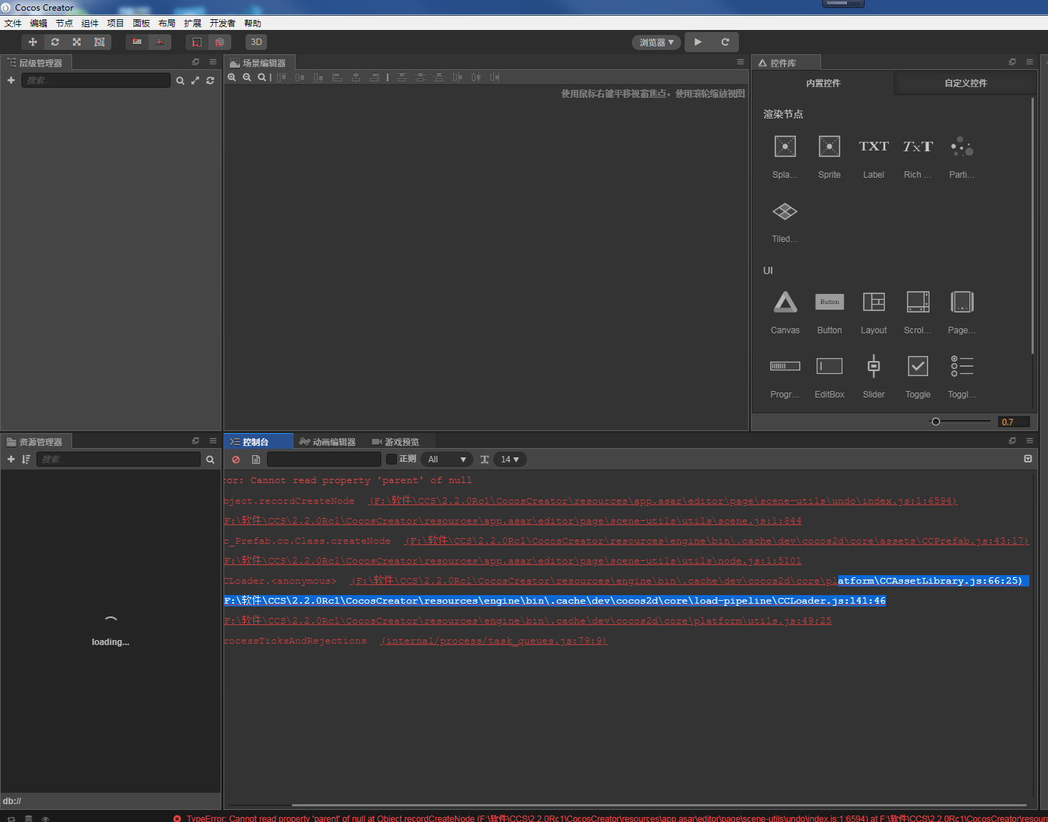 一打开项目就会报错,资源和层级面板都没有加载出来