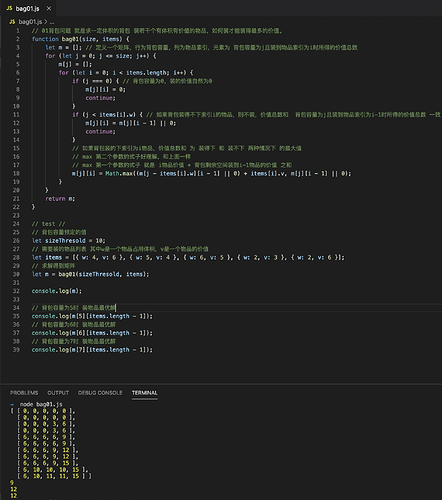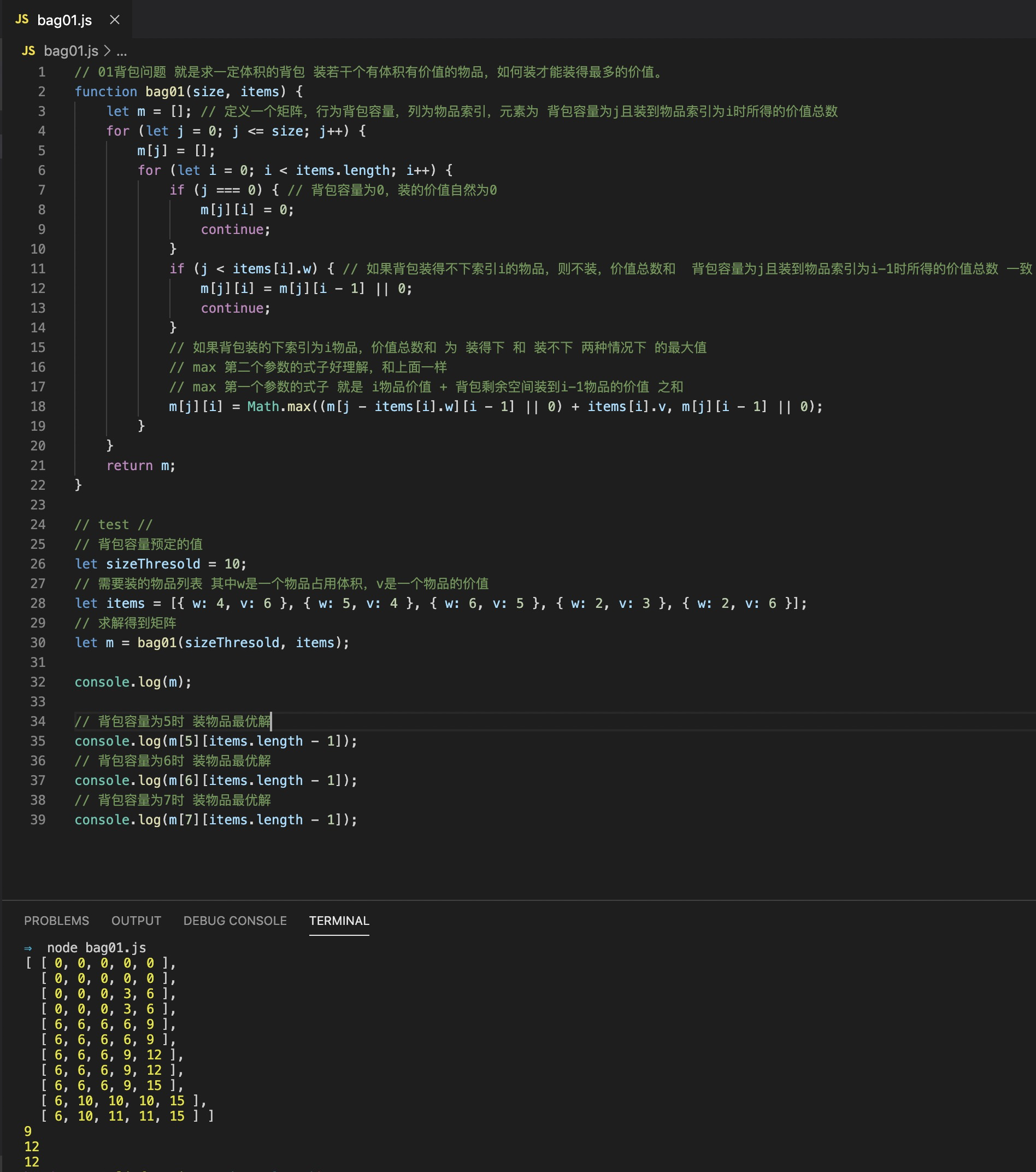 let m = []; // 定义一个矩阵,行为背包容量,列为物品索引,元素为 背包容量为j且装到物品索引为i时所得的价值总数