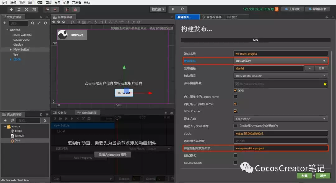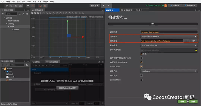 打开主域项目,在 菜单栏 -> 项目 中打开 构建发布 面板,选择 微信小游戏,填入 开放数据域代码目录。该目录是开放数据域构建后所在的路径,并且这个路径需要放在主域构建目录下。然后点击 构建
