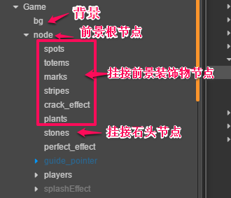 2,前景节点上挂实时生成的石头及其它关卡装饰物,并且游戏角色也在前景节点下移动