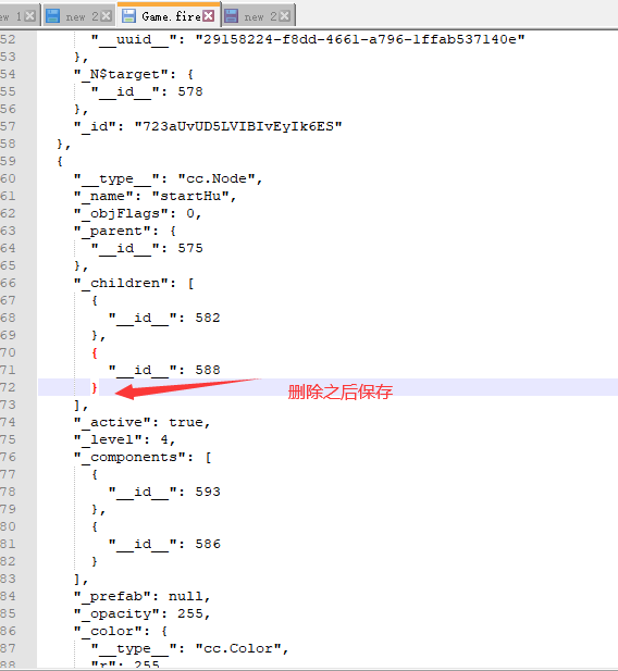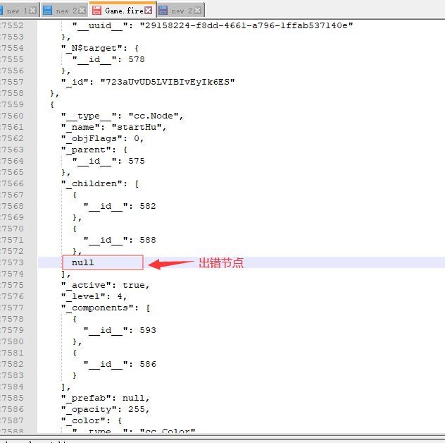 - 如果场景出错后保存过的朋友或者没保存场景但想保留场景错误之前到上一次场景保存之间所做修改的朋友可以进行如下操作:用文本编辑器打开场景文件(本人用notepad++): 搜索null, 会出现很多结果,大家找到截图里这样的null的时候把它删掉,保存之后重新打开creator然后重新打开场景看看,如果没改错就应该会修复好了。