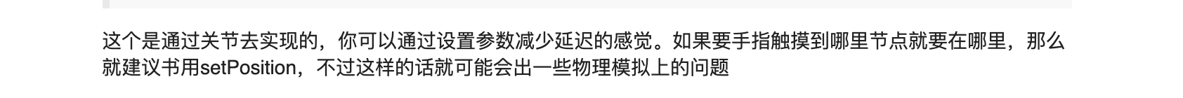 这个是通过关节去实现的,你可以通过设置参数减少延迟的感觉。如果要手指触摸到哪里节点就要在哪里,那么就建议书用setPosition,不过这样的话就可能会出一些物理模拟上的问题