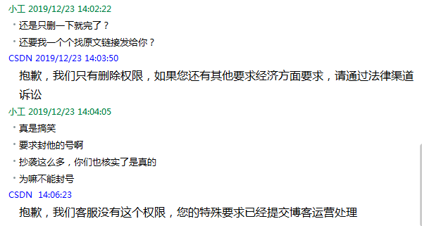 偶然发现,CSDN上一个家伙,把我公众号分享的内容,全部拿去当原创了,跟官方反馈,让我自己提供原创地址和抄袭地址,实在太多了,就找了一些过去,结果是,删了,没有其他处理,我一问,CSDN回复很官方。
