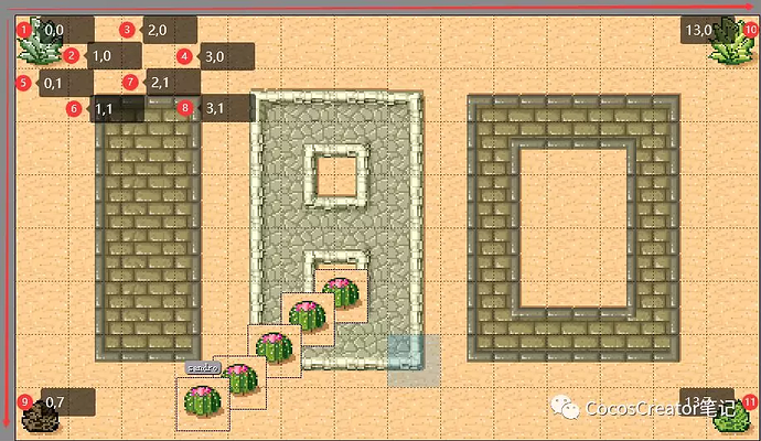 所有地图类型的坐标都是格子数,X轴向右增加,Y轴向下增加