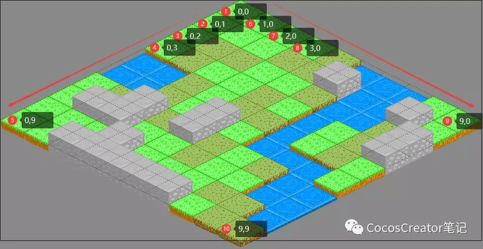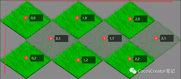 45度地图上方顶点第一个格子为起始点:(0,0)