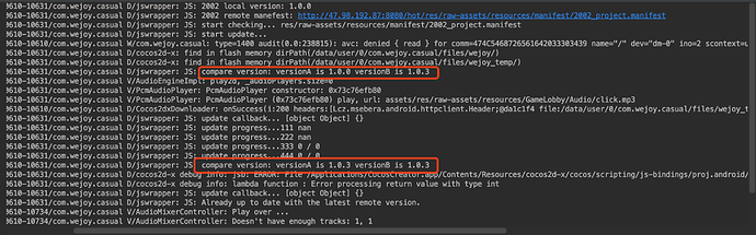this.assetsManager.loadLocalManifest(this.manifestUrl); 语句执行之后,就会打印出第一个compare,版本号是1.0.0,这应该是对的。