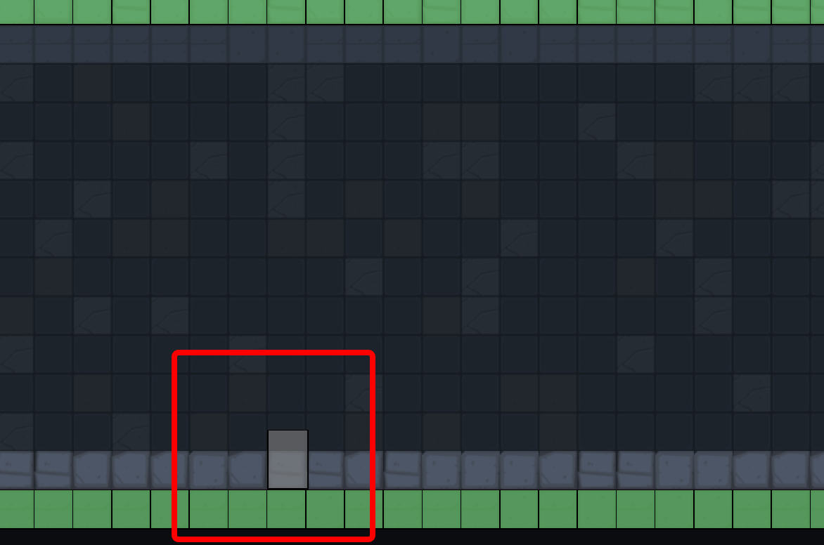 如上图红色框中所示,绿色部分为32*32的静态刚体,增加了physicsBoxCollider,灰色框中为动态刚体,也增加了physicsBoxCollider。当动态刚体 “贴着” 绿色边缘滑动时,遇到绿色刚体边缘时,概率停止移动。
