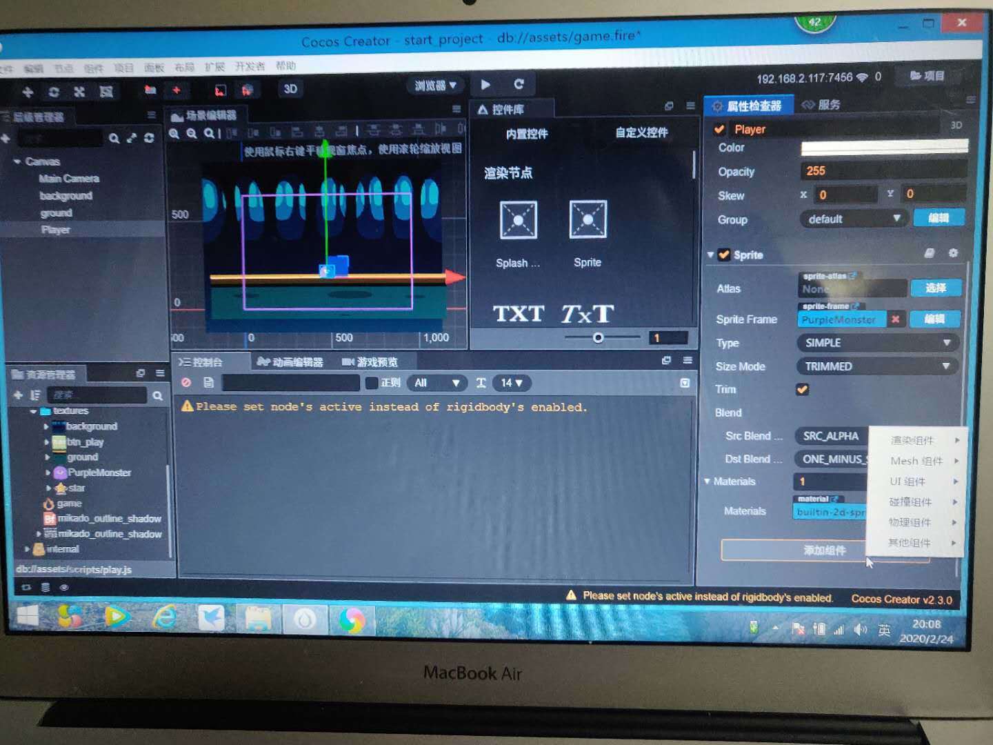 然后在属性检查器那边点击添加组件,结果没有和教程中显示那样有用户组件那一栏