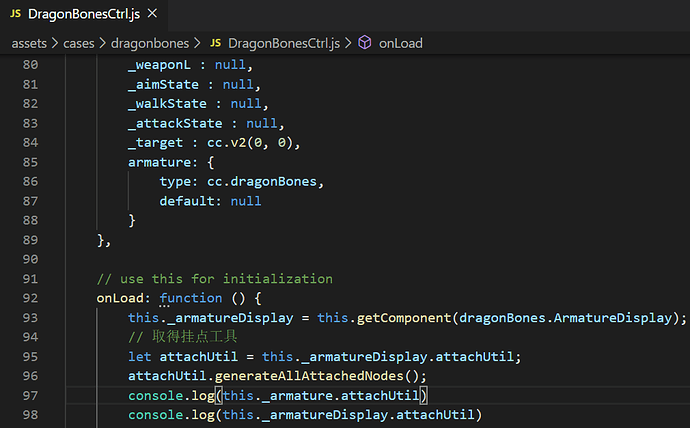 各位好,我想测试一下**龙骨的挂点**怎么用,然后用官方的龙骨例子,按照文档中Spine的写法测试了一下,但是出现了以下问题,我尝试过换其它的龙骨动画也是同样的问题, 我是新手看不懂源代码也没查到答案,所以在论坛求助一下各位大佬,谢谢。