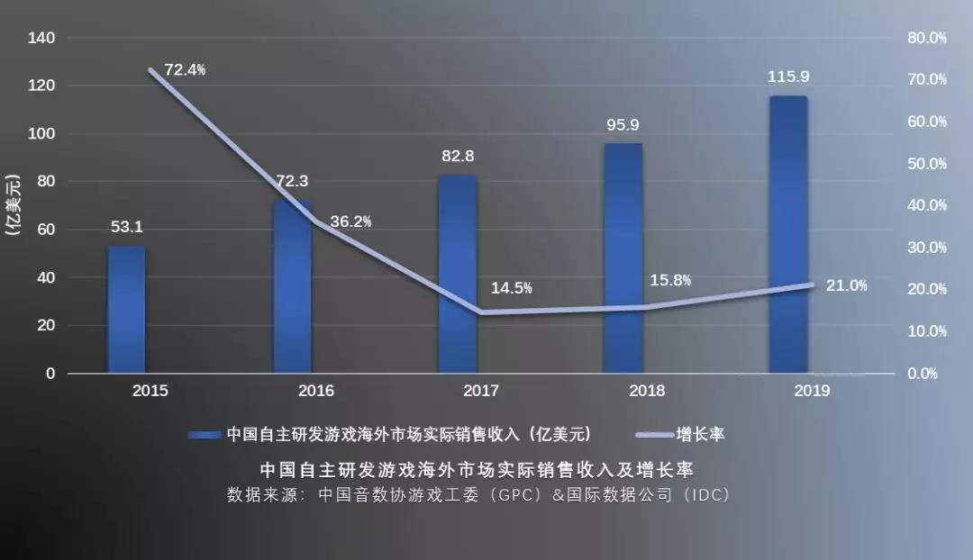 《2019年中国游戏产业报告》显示,中国自主研发游戏的海外市场收入在 2019 年达到 115.9 亿美元,增速 21%,远超国内。广阔的海外市场已为中国游戏开发者开辟出巨大想象空间。