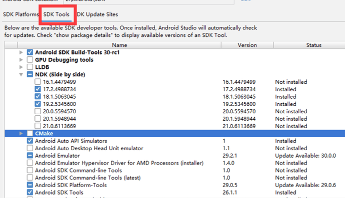 SDK和NDK其实都在你Android Studio下载指定的那个目录下,NDK可以选择你下载的版本,我用的18,可以编译成功!