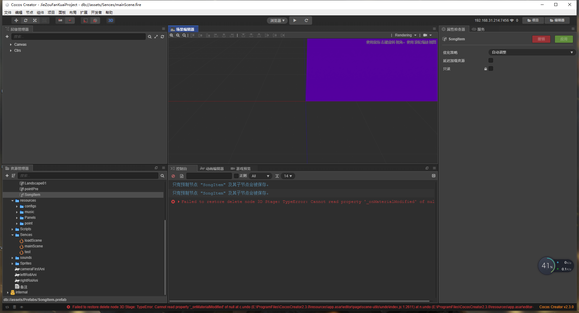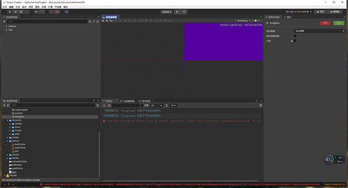 详细报错信息,包含调用堆栈:Failed to restore delete node 3D Stage: TypeError: Cannot read property ‘_onMaterialModified’ of null at c.undo (E:\ProgramFiles\CocosCreator2.3.0\resources\app.asar\editor\page\scene-utils\undo\index.js:1:2611) at n.undo (E:\ProgramFiles\CocosCreator2.3.0\resources\app.asar\editor-framework\lib\share\undo.js:1:508) at d.undo (E:\ProgramFiles\CocosCreator2.3.0\resources\app.asar\editor-framework\lib\share\undo.js:1:1201) at Object.undo (E:\ProgramFiles\CocosCreator2.3.0\resources\app.asar\editor\page\scene-utils\undo\index.js:1:8036) at Object.restore (E:\ProgramFiles\CocosCreator2.3.0\resources\app.asar\editor\page\scene-utils\lib\stash-scene.js:1:745) at d (E:\ProgramFiles\CocosCreator2.3.0\resources\app.asar\editor\page\scene-utils\edit-mode\modes\prefab.js:1:361) at Object.closeWithoutSave (E:\ProgramFiles\CocosCreator2.3.0\resources\app.asar\editor\page\scene-utils\edit-mode\modes\prefab.js:1:2367) at Object.close (E:\ProgramFiles\CocosCreator2.3.0\resources\app.asar\editor\page\scene-utils\edit-mode\modes\prefab.js:1:1961) at Object.run (E:\ProgramFiles\CocosCreator2.3.0\resources\app.asar\editor\page\scene-utils\edit-mode\index.js:1:817)