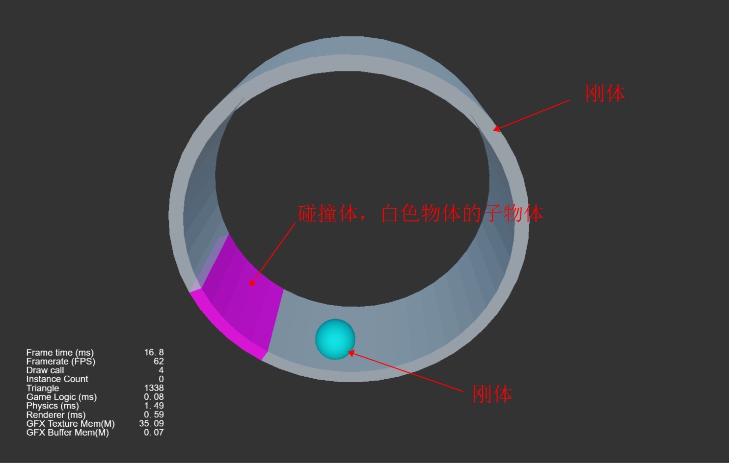 给白色的环指定角速度,让其旋转,小球可以和白色的环碰撞,但是不会跟粉色的部分碰撞,会穿过去;