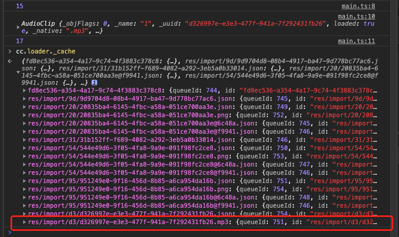 加载前 loader._cache 缓存的个数为15,加载后多了2 正常,看到mp3后缀的资源缓存起来了。