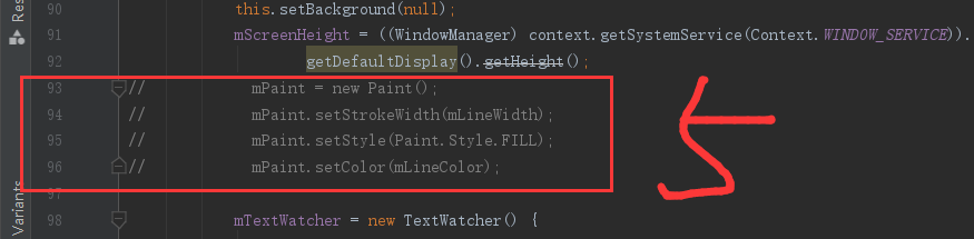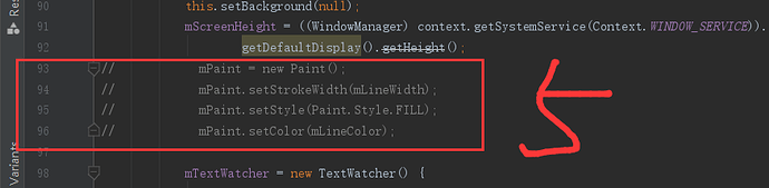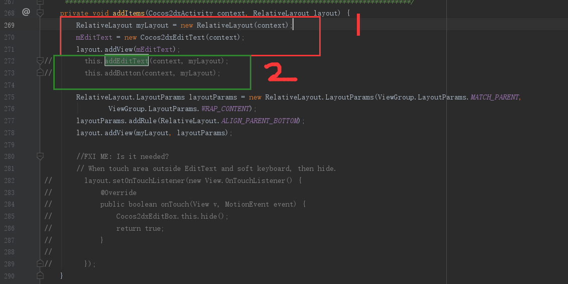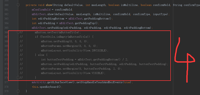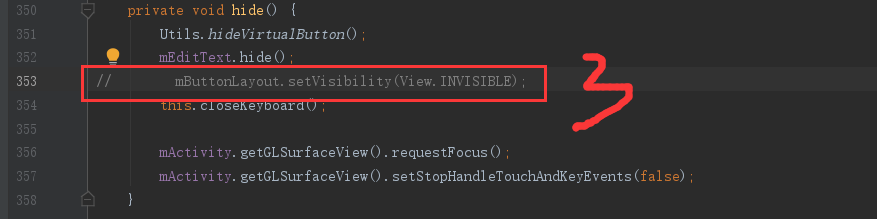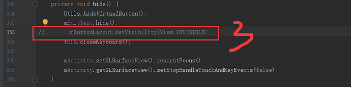 2.注释红框代码3,这是辅助输入框那个完成按钮,因为前面没有添加,所以在隐藏的地方需要注释掉不然会闪退。
