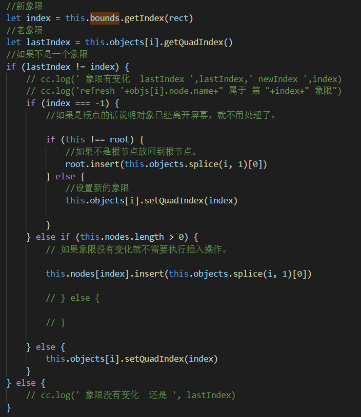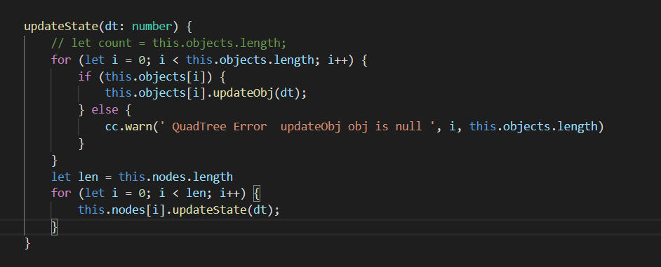 我是把四插入作为了对象管理器使用,要不然对象也需要更新,所以有了这一步操作。如果不这样你需要自己创建对象管理器,一个一个放进去,删除。通过四叉树直接管理省了不少事情。