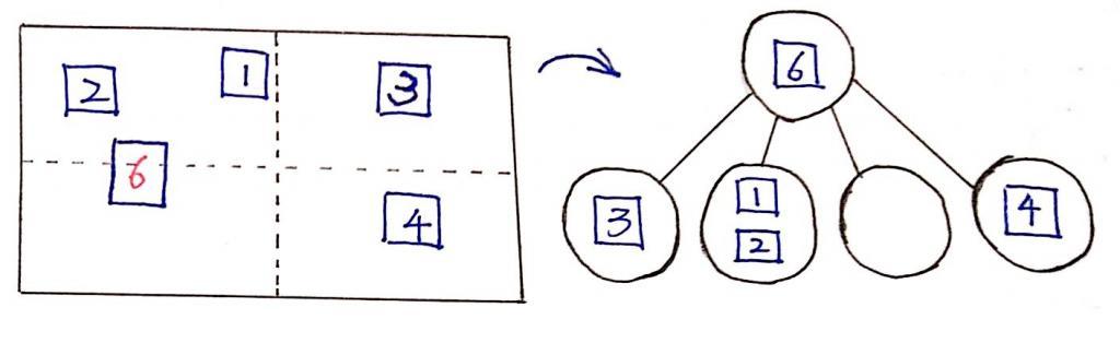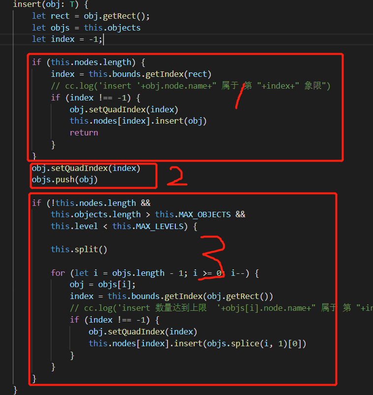 - 一直插入,当objects中的数量,超过了我们设置的阈值MAX_OBJECT,就会开始划分,产生子树,有了nodes,划分之后将自己管理的节点插入到子树中。再此之前,都不会走1,因为还没有产生子树。