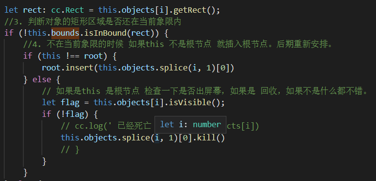 不在管理区域的话需要判断当前this是否为根节点,如果是说明对象已经出屏了。(这个时候可以通过对象实现的isVisible接口来控制是否回收,因为不是所有在屏幕外的都要回收,比如要进入屏幕的敌人,是不可能回收的,所以需要自己用isVisible接口来控制)。如果不是就将对象放入根节点,重新划分。