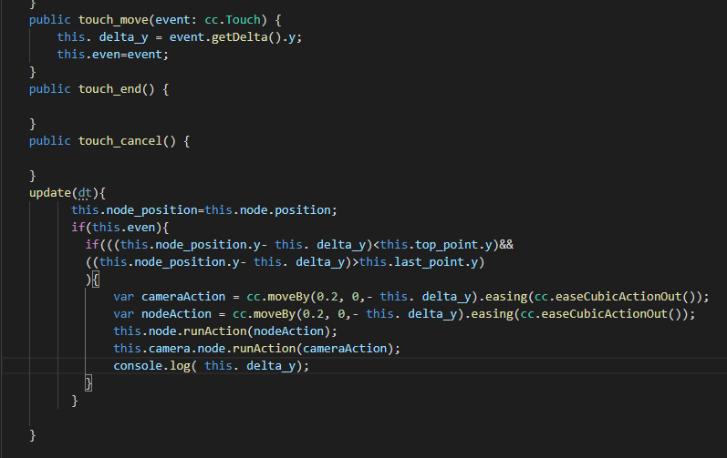原本的想法是从读取节点 的触摸事件进行相机的移动,但会冲出屏幕,出现有部分黑屏的情况。就把整个放到update,还是会有一样的情况