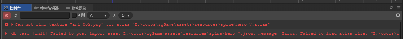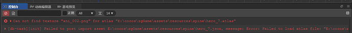 cocos控制台截图补充:[db-task][init] Failed to post import asset E:\cocos\zgGame\assets\resources\spine\hero_7.json, message: Error: Failed to load atlas file: “E:\cocos\zgGame\assets\resources\spine\hero_7.atlas”. TypeError: Cannot read property ‘setFilters’ of null