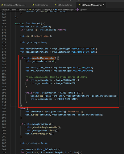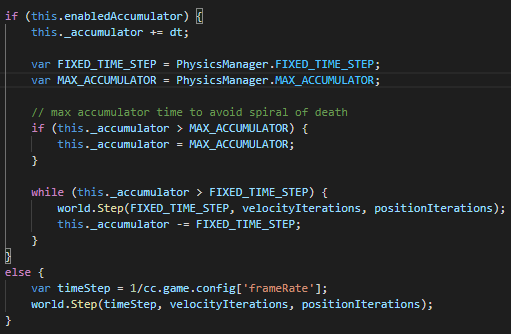 let aim = Math.floor(cc.director.getTotalTime() / 1000 / this.fixedUpdateStep); while(this.fixedUpdateTimes < aim){ ++ this.fixedUpdateTimes; this.fixedUpdate(this.fixedUpdateStep); }