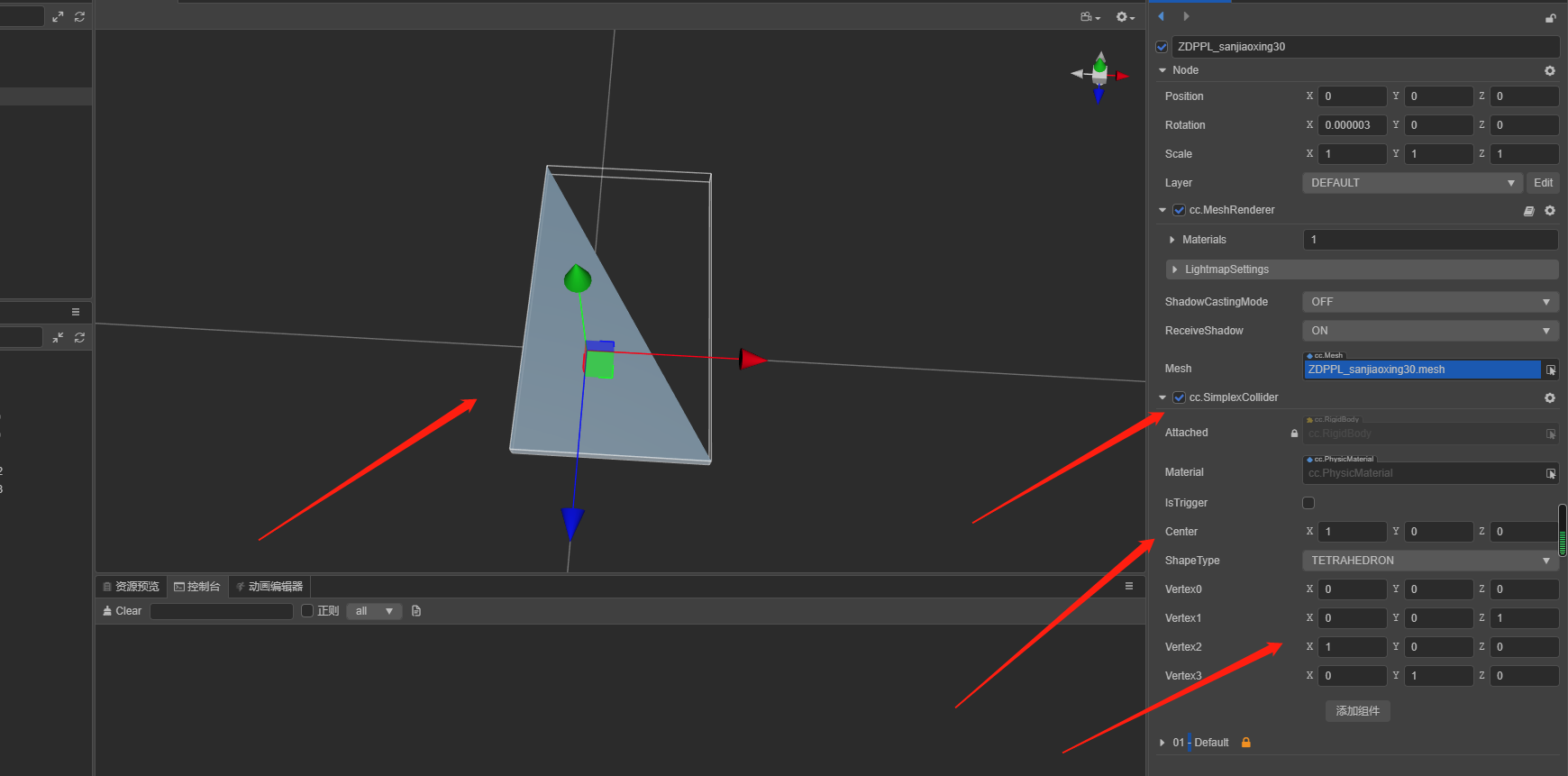 在它底下建三个子节点,调整三个子节点位置,然后把坐标填进SimplexCollider的Vertex0/1/2里?