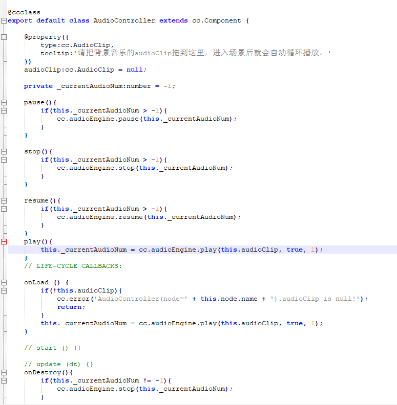 可以看到是使用cc.audioEngine.play()来播放的,背景音乐设置为自动循环播放。
