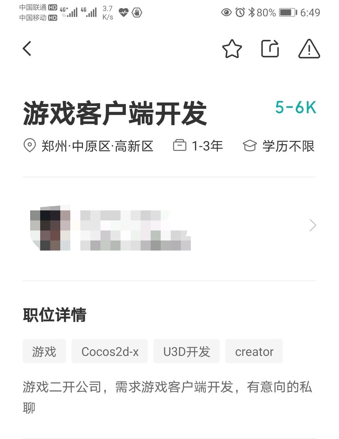 1-3年工作经验,地点郑州,工资5k,要求,cocos,unity,【安卓,ios,要求会打包和对接sdk】。