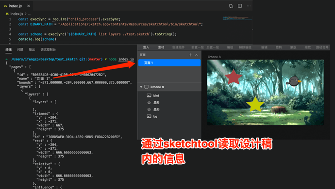 完整的demo代码可以点击原文跳转查看,这是一个演示级别的demo,只做了节点和sprite的映射生成,有兴趣的读者可以自行扩展。demo中并没有实现sketch生成JSON这一步,而是直接读取了一份给定的scheme(第三方工具生成),可能大家会有些疑问,文章开头提到了sketchtool可以读取设计稿的节点信息,那直接递归遍历节点不就可以生成对应的描述文件了吗?