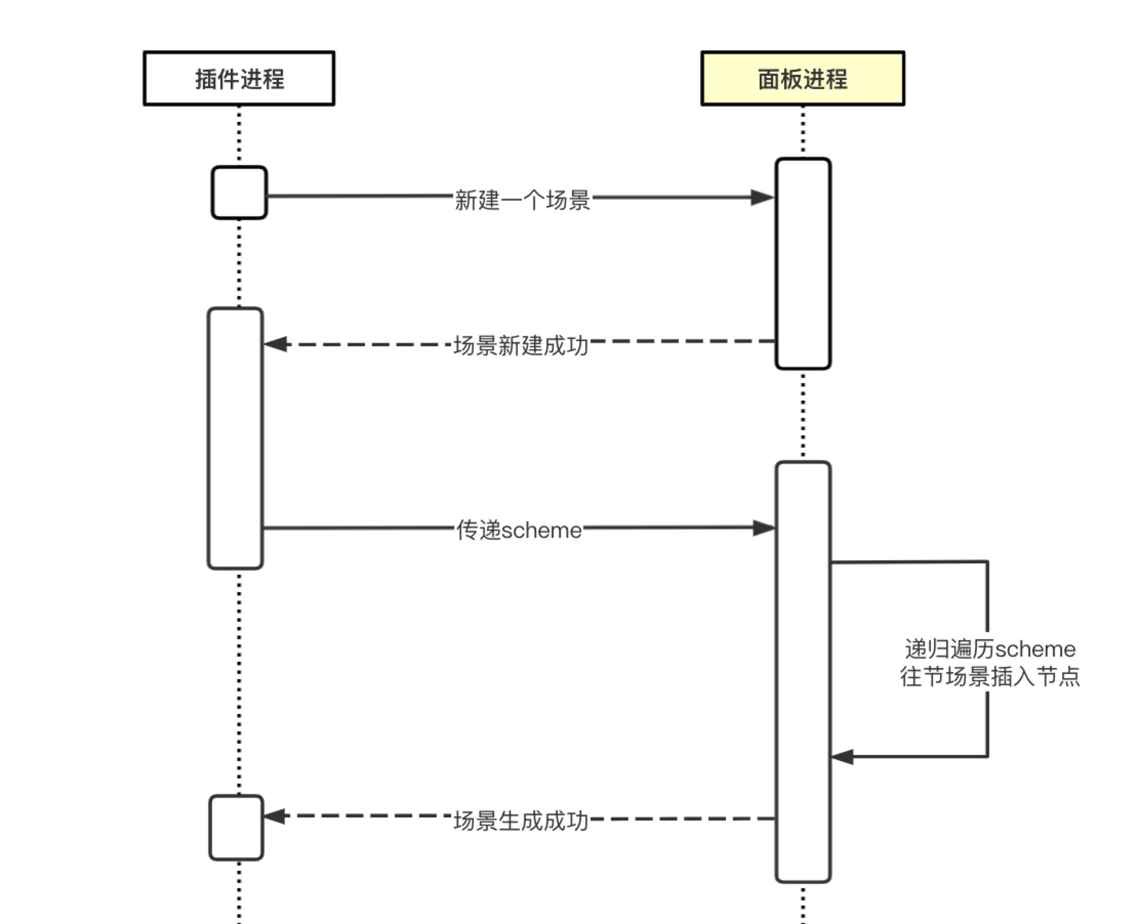 有了设计稿的结构描述文件+资源,接下来要在引擎的界面编辑器上还原就比较简单了,这里有两种方式,一种是直接转换,把设计稿的scheme描述文件转换成引擎界面编辑器的fire描述文件,引擎生成界面描述语言这部分源码并没有开源,需要我们自己去做对比和转换会很费精力,而且不好维护;第二种方式就是利用引擎提供的编辑器扩展功能,在插件的运行进程去调用引擎的面板进程,递归遍历scheme然后动态地往场景内插入节点,从而把界面还原出来。异名这次的演示就是基于第二种,两个进程间简单的信息流如下: