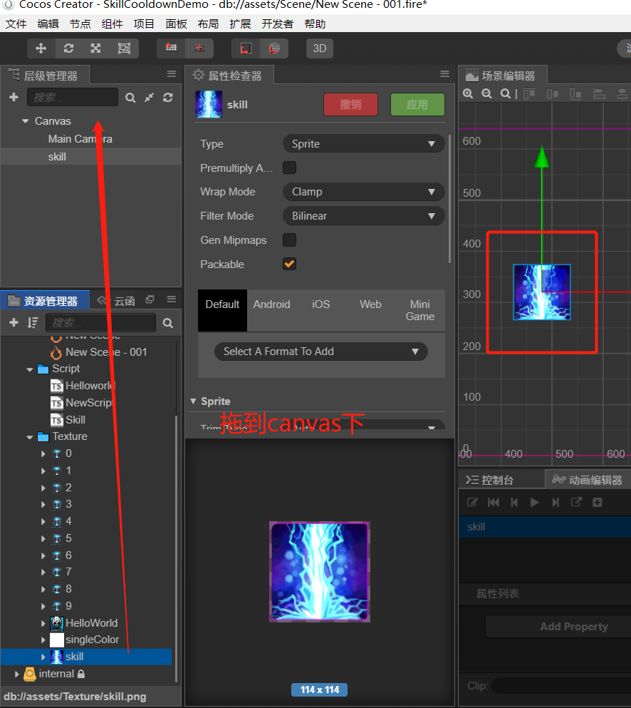 首先将技能按钮的图片拖到canvas下