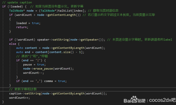 下面的分别是更新字幕和翻页的完整代码(由于是打字机效果, 布尔值loaded指示当前页是否已经打完)