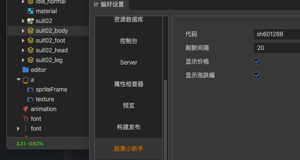 然后在 CocosCreator 菜单里的偏好设置,会多一个股票小助手的选项卡。