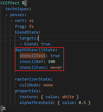 请问要如何开启 effect 中的模板测试功能,我这边按照 cocos creator 3d 的文件