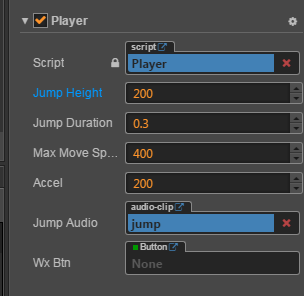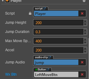 换另一种方式,在要控制移动的结点(Player)脚本上添加按钮属性: