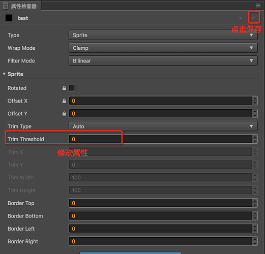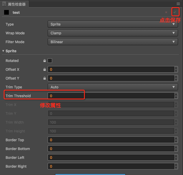 在属性检查器中,将 Trim Threshold 属性修改为 0,然后点击右上角的保存按钮: