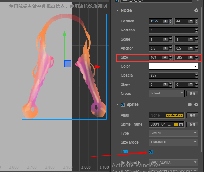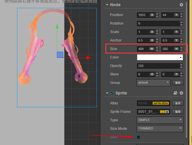 这样修改之后,再使用此图片创建 Sprite,就不会进行 trim 了。(原来创建的 Sprite 还是需要手动修改大小)。